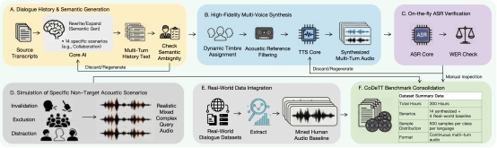 图注:CoDeTT数据集六阶段构建流水线全景图——从文本生成到声学模拟,再到真实数据融合,展示数据工程的完整性和严谨性。
