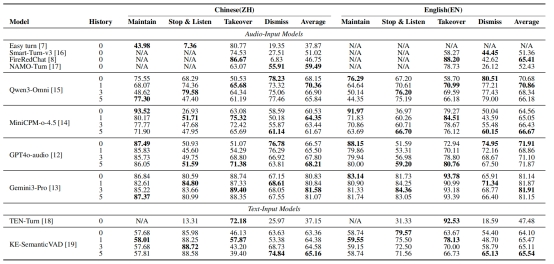Easy Turn、FireRedChat、Smart-Turn-v3、NAMO-Turn——这些专门做端点检测的选手,在"接管话轮"(Takeover)上分数很高,FireRedChat中文达到86.67%。