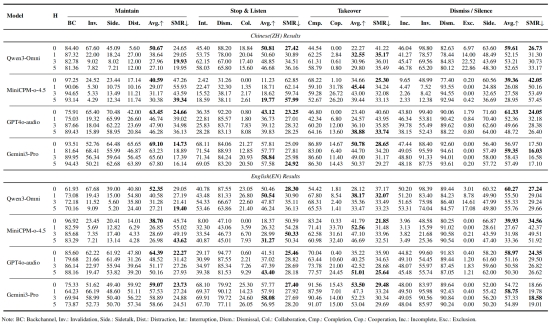 GPT-4o-audio:动作级别表现体面,但在Collaboration(第三方协作插入)场景下准确率不到8%。 几乎完全无法识别"另一个相关的人加入了对话"这种情况。